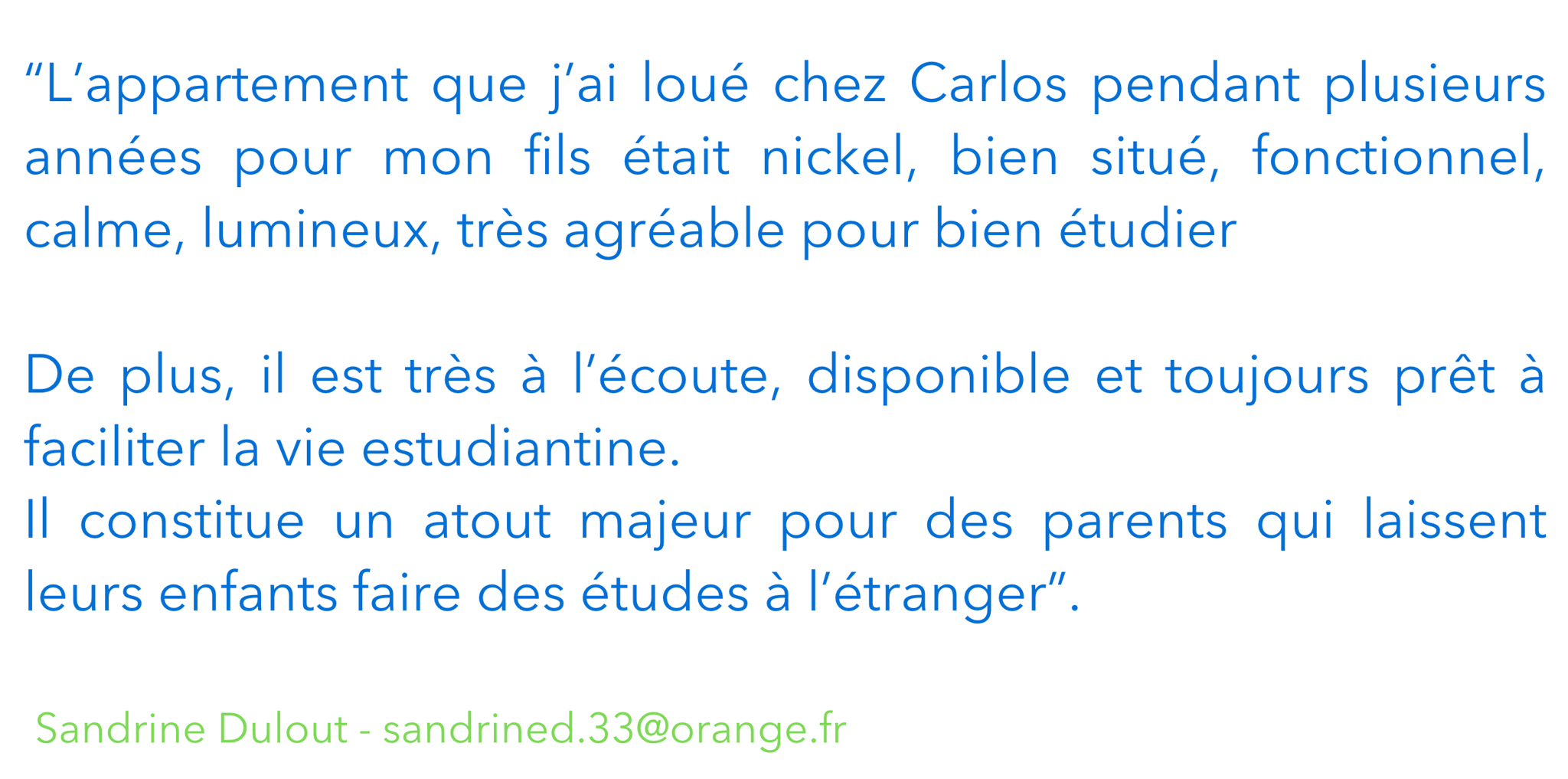 Je les ai soigneusement sélectionnés car ils me semblent bien convenir à des étudiants du fait de leur bon rapport qualité-prix et de leur situation au calme et parce que les propriétaires m'ont démontré au fil des annnées leur sérieux.